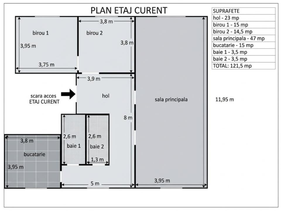 - birou 1: 15 mp - birou 2: 14,5 mp - bucatarie / birou 3: 15 mp