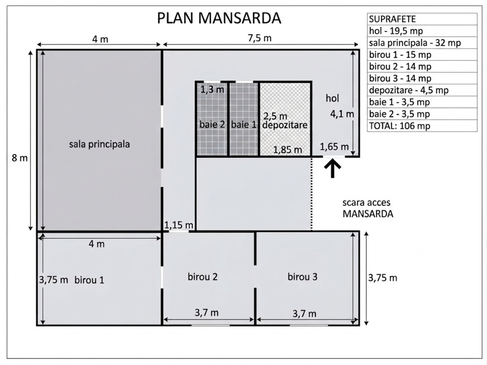 - sala principala: 32 mp - compartimentabil in doua spatii cu acces separat (doua usi de acces din holul conector)
