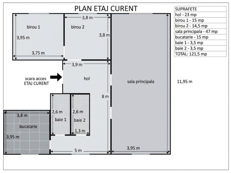 - sala principala: 47 mp - compartimentabil in doua spatii cu acces separat (doua usi de acces din holul conector)