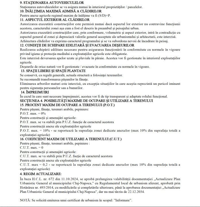 Construibil: Conform PUG, se permit anexe agricole/case de vacanță (regim S/D+P) cu o amprentă la sol de până la 400 mp (POT 10%).